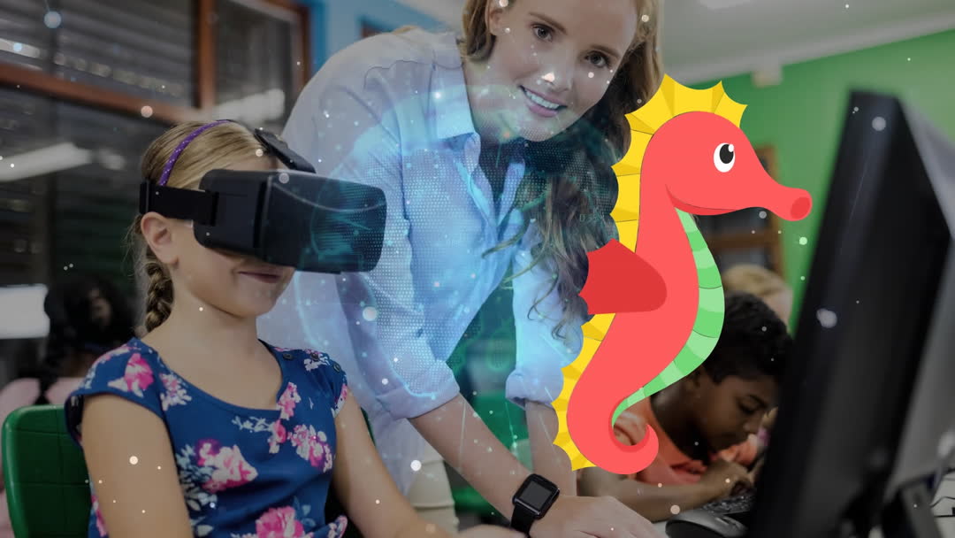 This video depicts an engaged teacher guiding a student using a VR headset in a classroom, highlighting modern educational techniques. The digital overlays inspire a sense of innovation and the globalized reach of technology in learning. This visual is ideal for marketing educational technology services, illustrating articles on modern teaching methods, and promotional materials for tech workshops in schools.