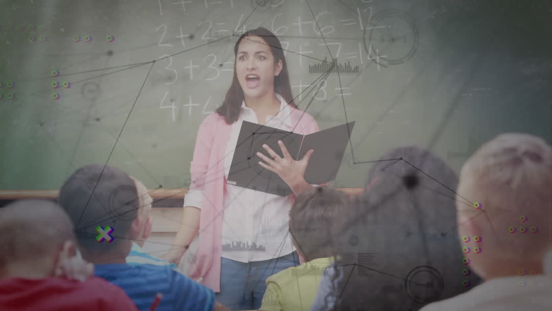 A teacher engages with motivated students in an interactive classroom discussion. Mathematics equations are displayed on the chalkboard as part of the problem-solving activity involving network connections. Useful for illustrating concept of innovative teaching, dynamic classroom environment, and engaging educational activities in promotional material, digital learning platforms, or educational activity guides.