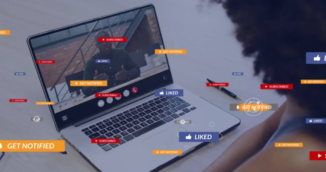 This video frame captures a participant engaging in a tech webinar. The overlay of social media icons emphasizes interaction and online presence. Ideal for illustrating concepts of modern virtual communication, technological training, or digital professional networking.