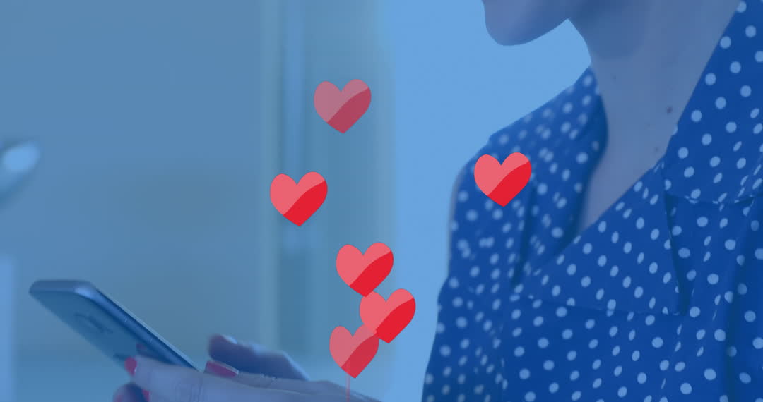 Bright hearts float over blue background as a person interacts with a smartphone, symbolizing social media engagement and online interaction. Useful for depicting digital communication, increasing followers, online connection, and the impact of technology in daily life.