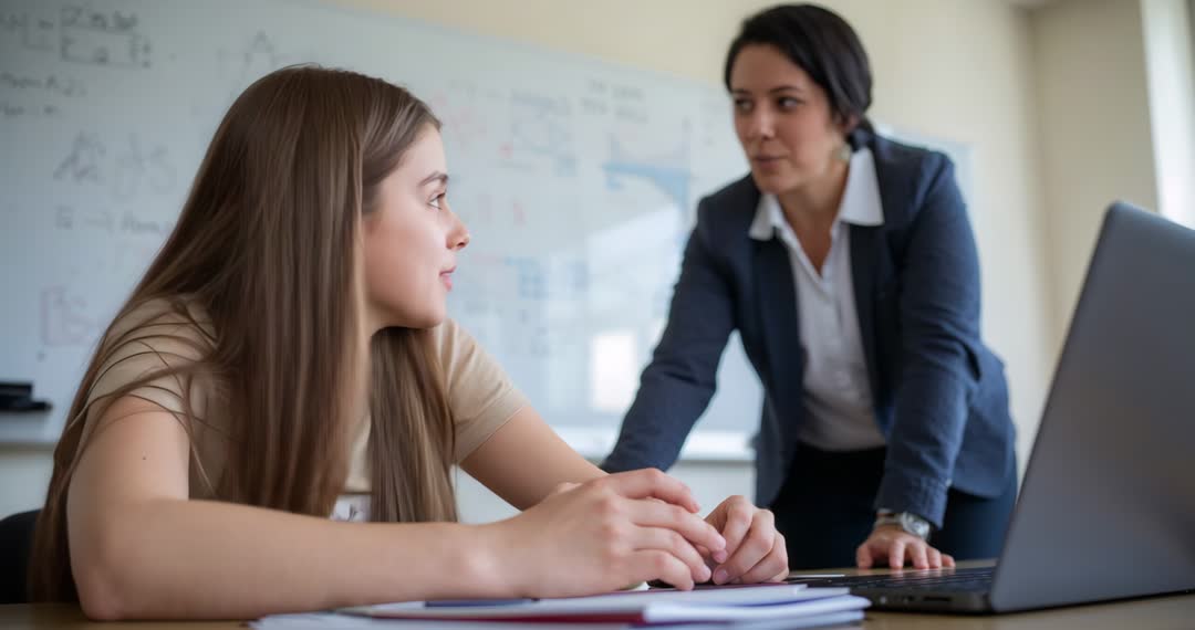 AI Generated Video. Middle school classroom live discussion featuring student attentively focusing on teacher, utilizing laptop shows modern education environment driven by technology and personal mentorship. Ideal for articles or content related to educational methods, the integration of technology in learning, and teacher-student interaction.