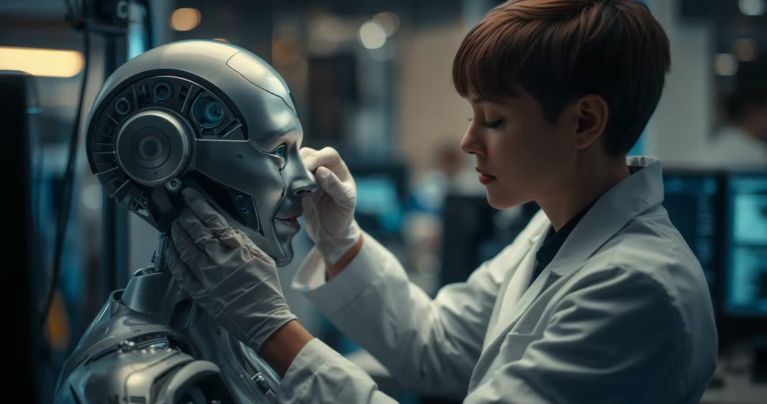 AI Generated Image. An engineer, wearing gloves, is meticulously adjusting a humanoid robot's face in a bustling tech lab setting. The scene captures elements of technology and innovation, emphasizing the close human interaction with advanced AI. This video can be used to represent themes of cutting-edge robotics, future concepts in artificial intelligence, and precise engineering work. It is ideal for illustrating advancements in tech industries and could be used for educational or industrial presentations or articles that highlight robotics and humanoid development.