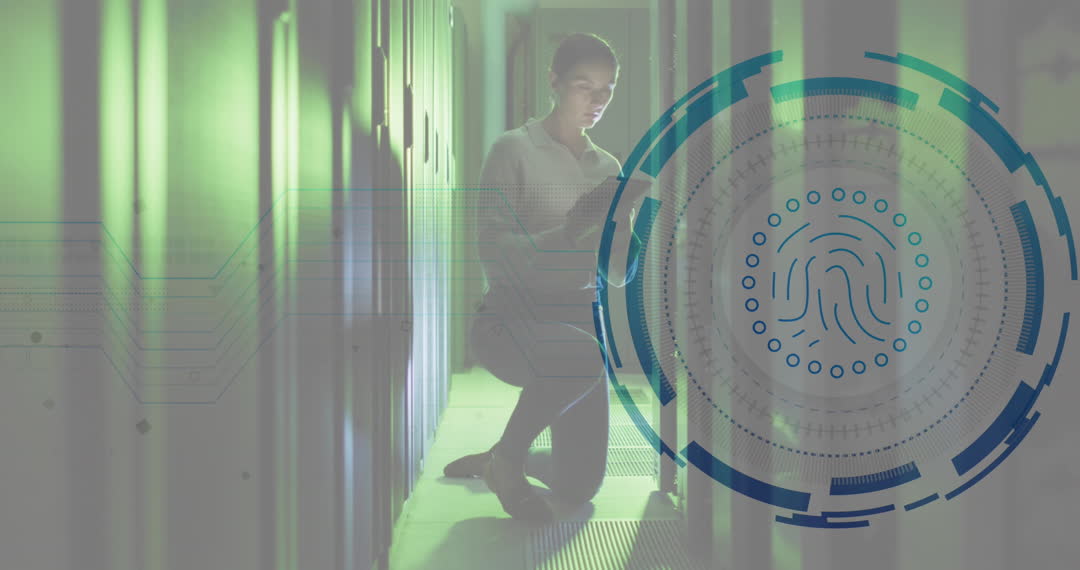 A female engineer kneeling in a dimly lit server room uses a tablet to analyze cybersecurity data, highlighted by an overlaid digital fingerprint scanner graphic. This scene visually combines themes of modern technology, network management, and security protocols. Useful for illustrating concepts in tech industry, cybersecurity awareness, and digital transformation.