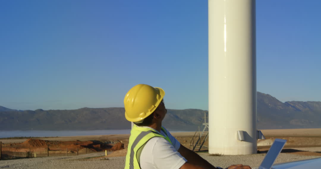 Male engineering professional wearing safety gear using a laptop while overseeing wind turbine operations in open landscape. Symbol of renewable resources and sustainable technology. Ideal for content about engineering, renewable energy initiatives, rural development, and modern technology project management.
