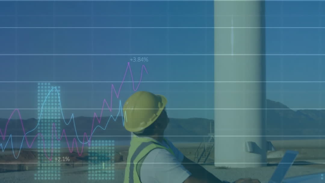 - Engineer Analyzing Wind Turbine with Financial Data Overlay