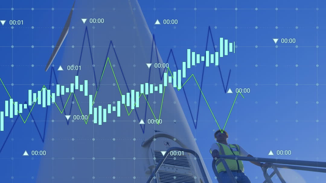- Engineer Climbing Wind Turbine with Digital Financial Graph Overlay