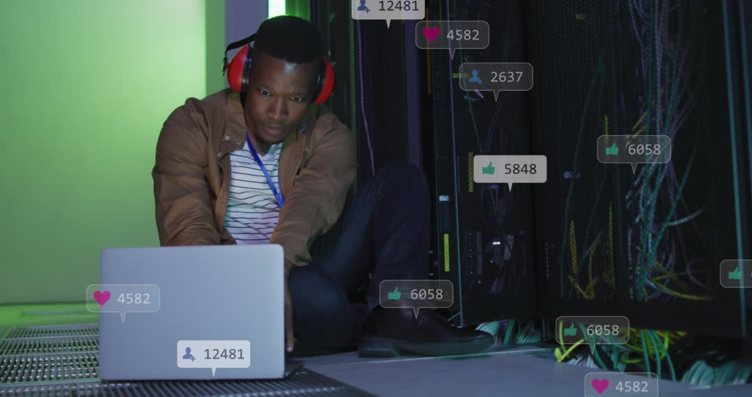 A focused engineer is working on a laptop in a high-tech server room, surrounded by various live-in-time social media interaction icons like likes and messages. The blend of information technology with social media connectivity indicates aspects of modern workplaces intertwined with online audience engagement. Suitable for themes related to data management, IT professions, and the impact of social interactions on technology-driven environments.