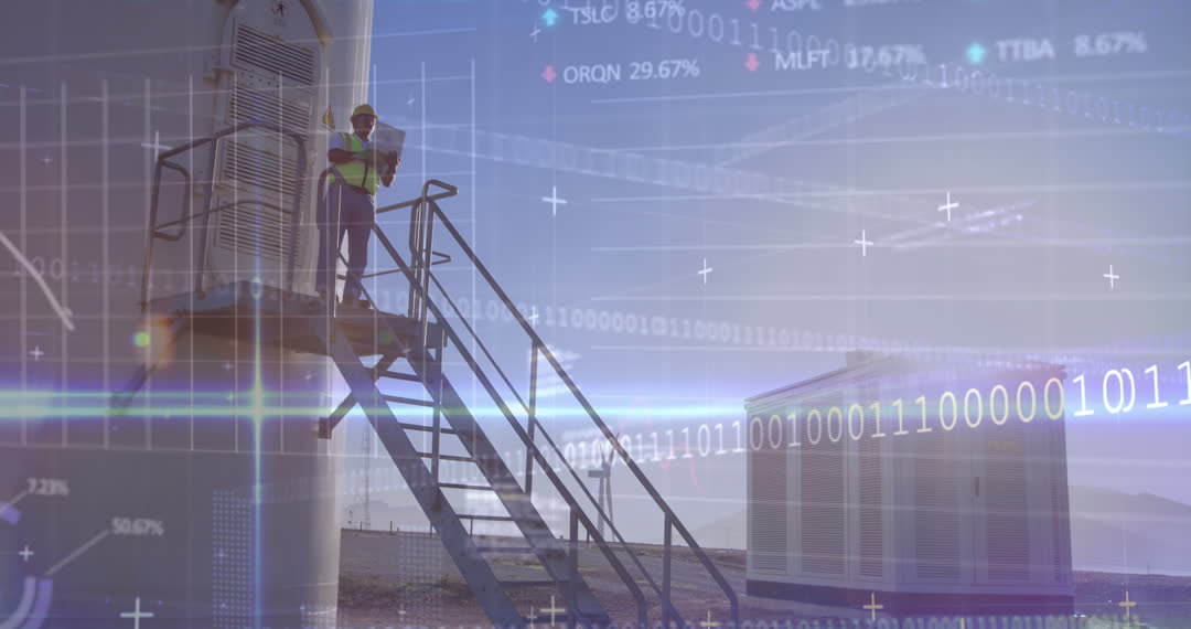 Image depicts an engineer inspecting a wind turbine against a backdrop of financial data and binary coding, symbolizing the intersection of technology and renewable energy. Ideal for illustrating concepts in sustainable business practices, environmental technology advancements, and the role of data in modern industries.