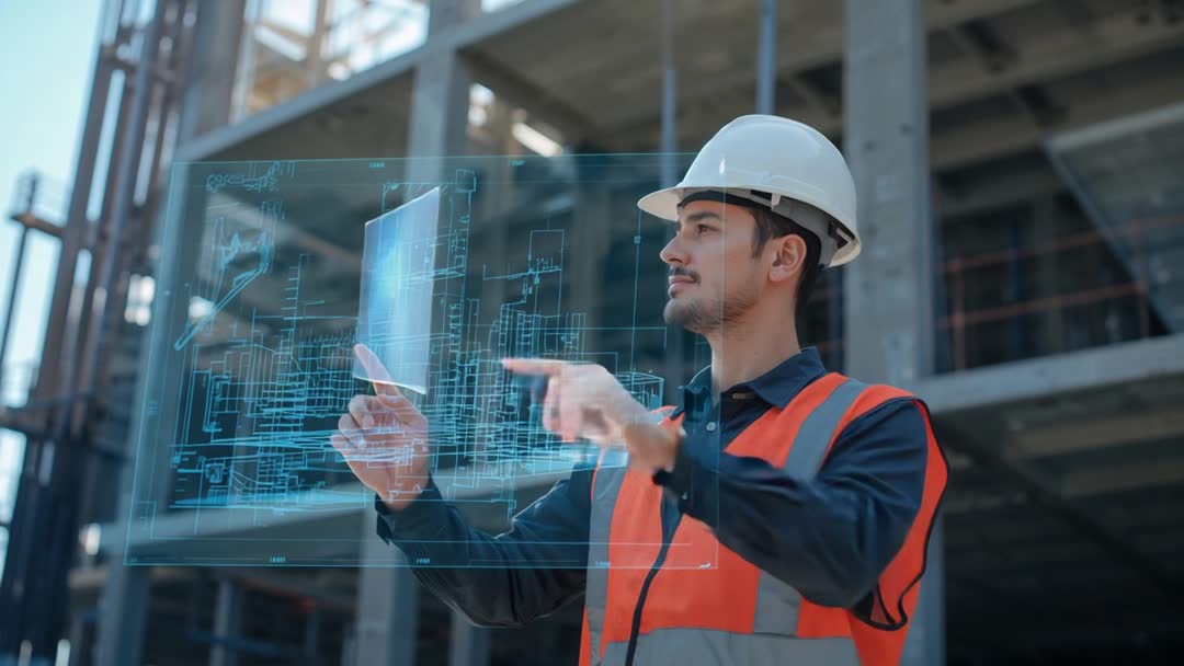 AI Generated Image. Video showing engineer wearing white hard hat and orange safety vest interacting with holographic building model and rotating 3D plans over active construction site. Gesture-controlled virtual interface overlaying technical wireframe and floor plans, highlighting structural elements and measurements. Cinematic shallow depth of field keeping background scaffold and concrete frame slightly blurred while augmented blueprint remains sharp. Use for technology and construction topics: AR in architecture, BIM demonstrations, digital twin presentations, training modules, corporate website hero, investor pitch decks, industry reports, marketing campaigns. Suitable for editorial and commercial use in engineering brochures, safety training, innovation articles, conference slides, online courses, and social media ads.