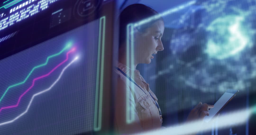 A female engineer is monitoring a server room, interacting with digital interfaces and complex data graphs displayed on screens. This is ideal for use in content related to IT solutions, data management, and technology advancements. It highlights the key role engineers play in maintaining and analyzing server performances.