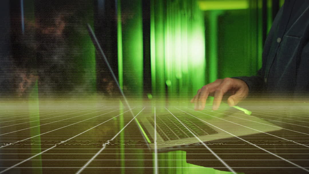 Shows touching a laptop in a visually compelling technology environment, light grid overlaid evokes high-tech networking, and vibrant green glow is predominant. Suitable for use in presentations, business materials, or content highlighting data management, server technologies, cybersecurity, digital infrastructure, or futuristic computing.