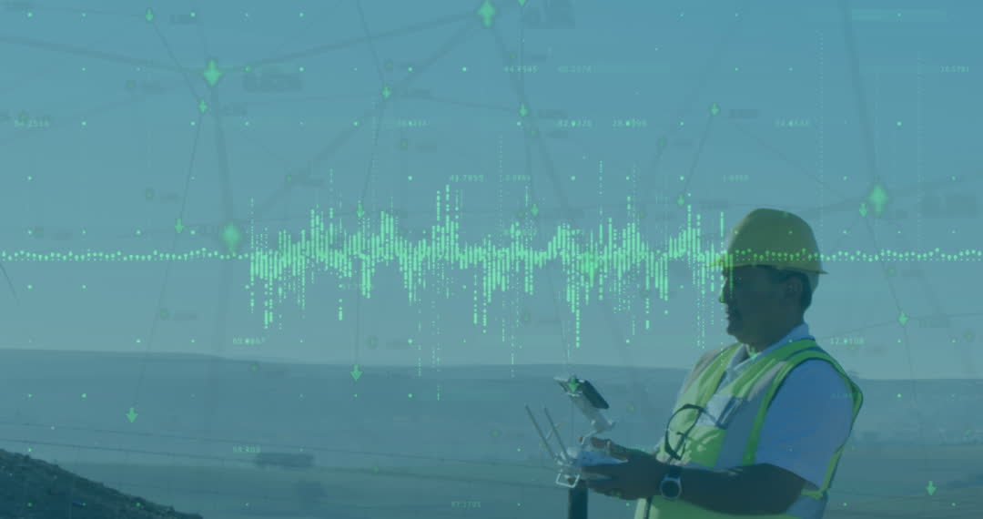 Engineer surveying a mineral site using a drone controller under a digital binary code display. Multiple layers of information suggest data integration in fieldwork, suitable for topics related to technology in mining, industrial automation, environmental data collection, and modern engineering practices. Useful for illustrating themes of innovation and the role of technology in industry.