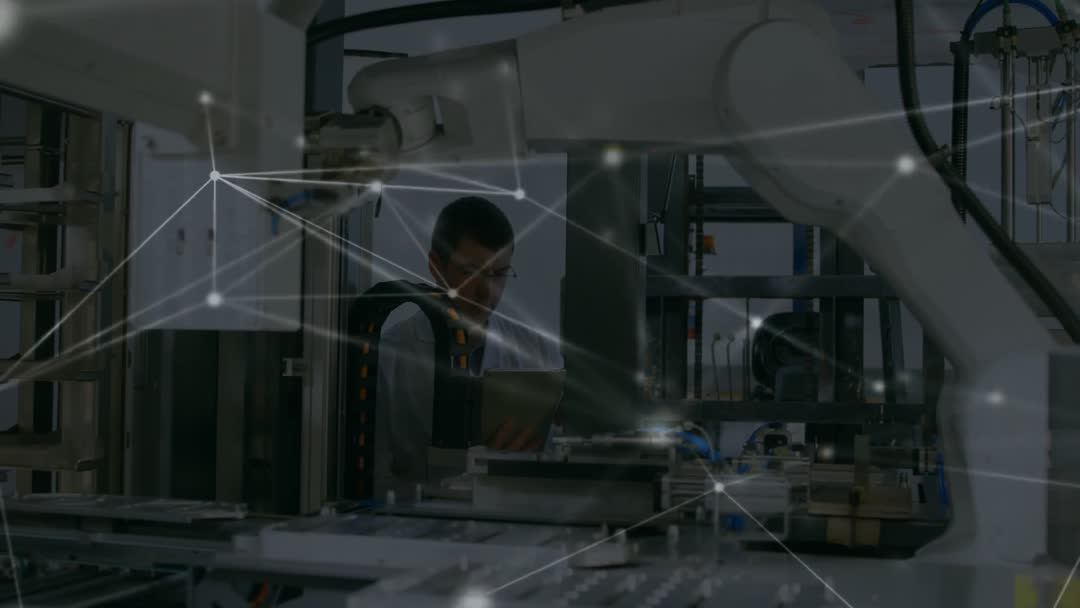 - Engineer Using Tablet to Digitally Network Automated Machines in Factory