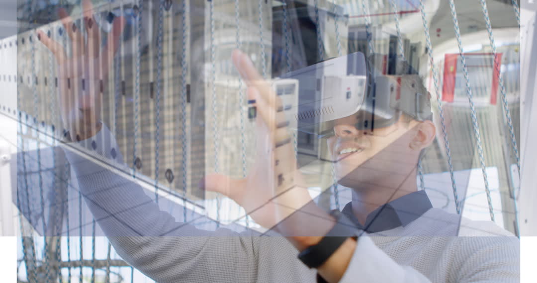Contemporary video of a man immersed in virtual reality while enhancing network solutions, depicted with an overlay of a server room. This showcases the synergy between technology and practical engineering. Suitable for materials on modern tech advancements, the evolution of IT professions, or VR applications in business and education.