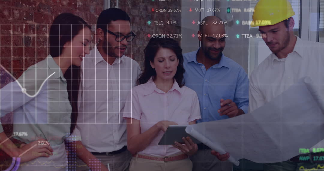 Engineers standing together reviewing blueprint, integrated with digital graphics displaying stock market data on grid. Ideal for illustrating concepts of collaborative design, project management in engineering, and technology-enhanced decision-making in business contexts.