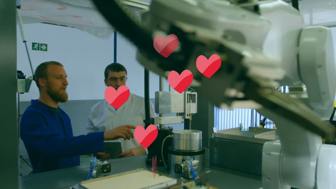 Two engineers continue collaborating in a high-tech laboratory filled with advanced robotics and equipment. The presence of animated heart emojis suggests a successful or positive outcome, possibly referencing their enjoyment or love of the work. Ideal for illustrating high-tech solutions, teamwork innovation, or the emotional aspect of engineering and scientific processes.