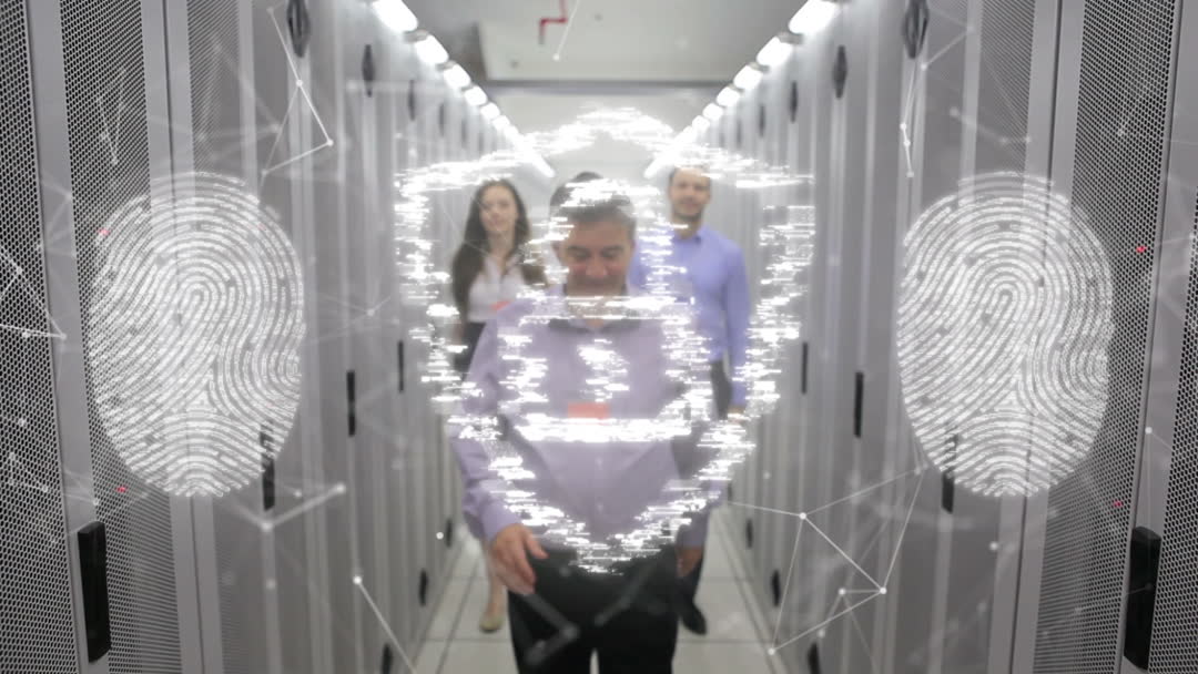 This depicts engineers in a server room focusing on securing data infrastructure. It highlights modern cybersecurity measures with a digital shield and fingerprint motifs, indicating protection protocols and data integrity. Useful for illustrating concepts of data protection, IT security, and technological advancements in business settings.
