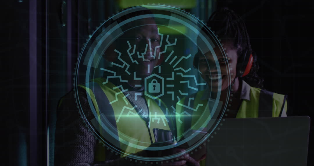Two engineers wearing yellow vests smiling in a server room with a large digital security padlock animated over them, symbolizing the implementation of cyber security measures in data storage environments. Suitable for illustrating concepts of digital security, engineering professions, and technological advancement in business settings.