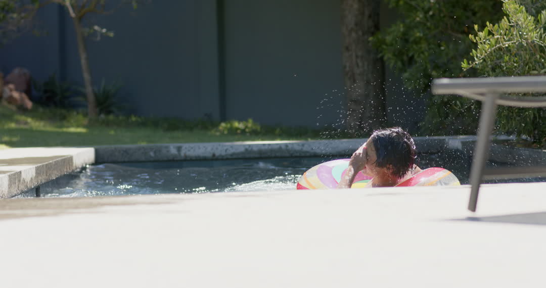 Person splashing water in a backyard pool while relaxing on a pool ring on a sunny day. Use for illustrating outdoor leisure, summer fun, or relaxation themes. Ideal for lifestyle, travel, or recreational content.