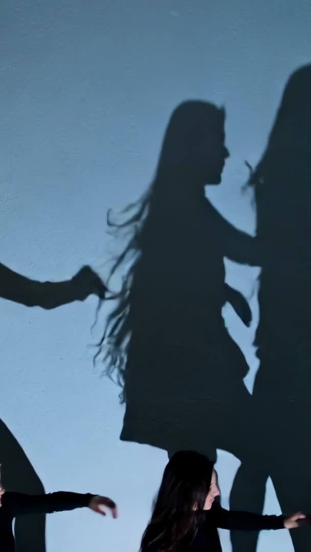 AI Generated Image. Two women are entering frame in dark tops, casting oversized silhouettes across blue wall while hair and arms are creating dynamic lines. High-contrast lighting is emphasizing shadowplay and movement, creating moody, cinematic atmosphere. Vertical composition is optimized for mobile and short-form video platforms, making it ideal for reels, stories, TikTok, and app promos. Marketing teams are using for dance and choreography showreels, theatrical promo, lighting tutorials, creative advertising, background for music videos or fashion campaigns. Color palette and negative space are lending well to text overlays, titles, and logo placement, enabling easy integration into social posts, event promos, and editorial layouts.