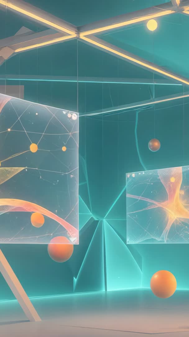 AI Generated Video. Scene showing tilting holographic panels and drifting neon spheres inside teal-lit chamber. Camera entering view with slow parallax motion and subtle reflections creating immersive depth. Lighting combining warm orange accents with cool teal tones for high-contrast futuristic look. Clip providing loopable segment and vertical 9:16 composition optimized for mobile playback. Use for tech product promos, mobile app intros, conference openers, social vertical ads, AR/VR demos, livestream overlays, and website hero sections. Use as animated background for title cards, lower thirds, UI mockups, and data visualization presentations to convey innovation and virtual interface themes.