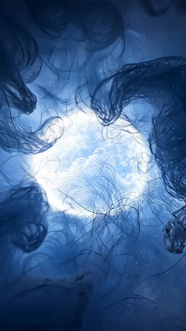 AI Generated Video. Showing blue ink diffusing inside glass tank, forming glowing core with swirling wisps and delicate filaments. Featuring deep indigo, cobalt, ultramarine tones with soft luminescent glow and subtle light leak. Capturing slow-motion fluid dynamics and macro textures for cinematic abstract visuals. Useful for background loops, motion graphics, title sequences, music visuals, wellness or tech campaigns, product promos needing moody abstract atmosphere. Providing vertical composition optimized for mobile, social stories, reels, vertical ads. Supplying high-contrast center glow for overlaying text or logo with negative space around core. Compatible with color grading, blending modes, masking, and speed ramping for custom transitions.