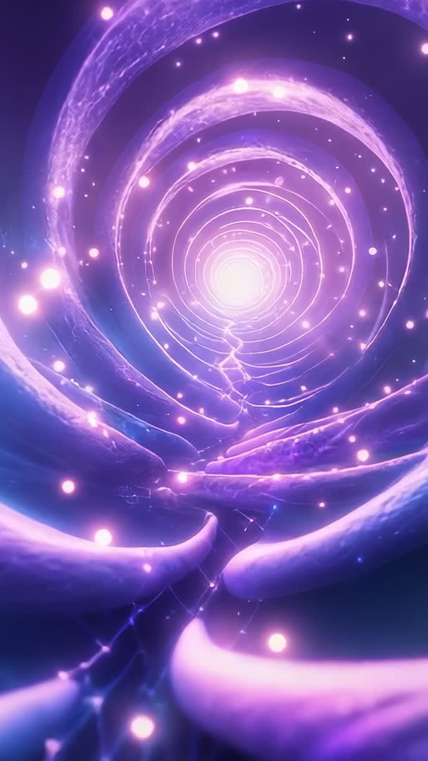 AI Generated Image. Vertical 9:16 motion clip showcasing camera advancing through glowing spiral rings and pulsing cable-like energy toward radiant core. Featuring violet and magenta color palette with electric blue accents and soft white highlights. Conveying futuristic, cosmic, immersive mood with dynamic particle trails and subtle lens glow. Offering loop-friendly flow, high-resolution output, compatibility with Premiere Pro, After Effects, Final Cut Pro. Ideal for sci-fi title intros, music video backgrounds, app splash screens, social media stories, meditation or wellness visuals, tech product launches, live event visuals. Suggestions for use: place behind minimal typography for dramatic openers, blend with soundtrack for ambient transitions, use as backdrop for branding campaigns or trailer sequences, integrate with lower-third graphics for broadcast packages.