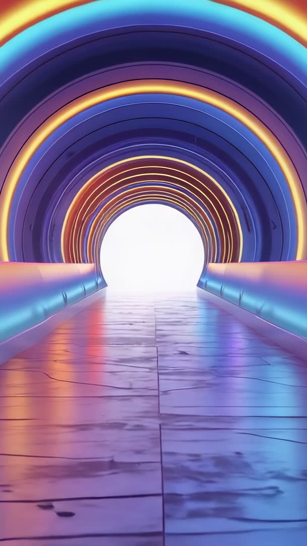 AI Generated Image. Entering neon tunnel, camera moving forward through concentric glowing rings reflecting on polished floor toward bright white exit. Electric blue, magenta, and warm amber bands shifting and blending, creating ambient futuristic atmosphere and strong sense of motion. Symmetrical composition and glossy reflections providing immersive, cinematic look with seamless looping potential. Serving as dynamic background for tech promos, powering app splash screens and onboarding, framing title openers and transitions, fueling electronic music visualizers, enhancing product reveal videos, supporting VR and AR demos, and elevating social vertical ads and stories. Layering text, logos, and lower thirds on bright exit area for clear messaging and easy branding.