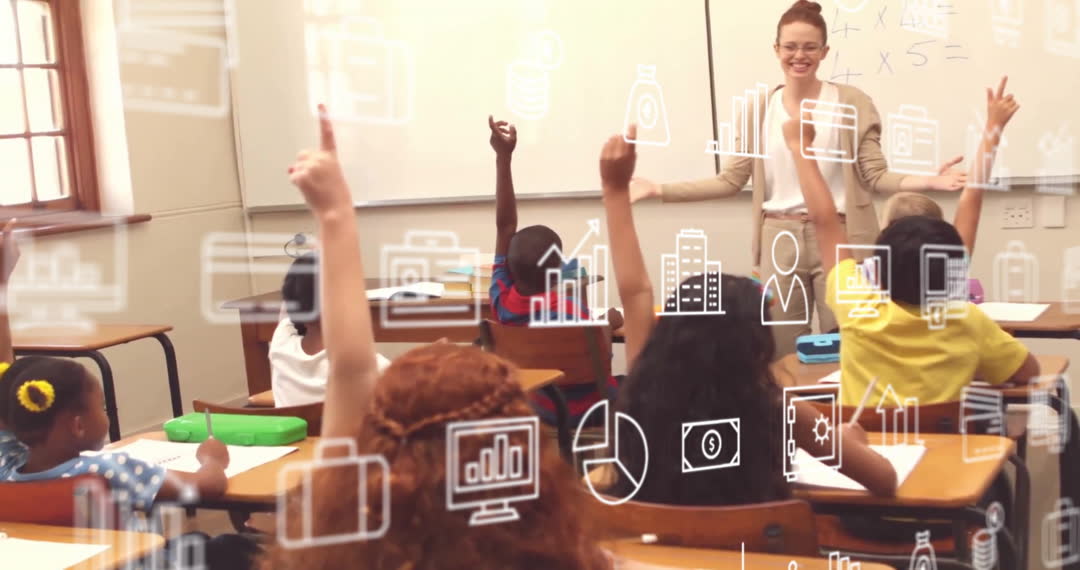 - Enthusiastic Students Engaging in Classroom With Innovative Icons Overlay