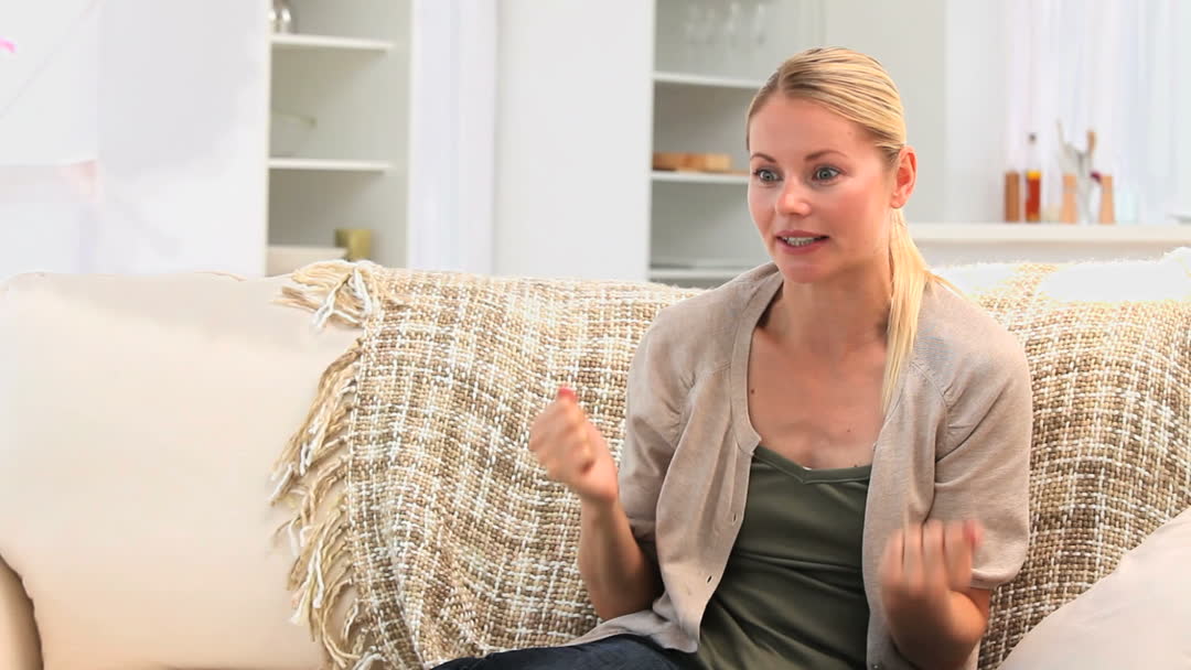 Blonde woman sitting on the couch in a cozy living room, enthusiastically watching a soccer match on TV. She is clenching her fists in excitement, reflecting her avid interest in the game. The scene suggests perfect stock videory for themes related to sports fans, home leisure activities, relaxation, and women's interest in sports.