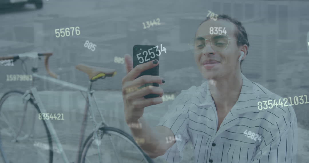 A person stands in an urban environment, utilizing their smartphone. Floating numerical data and figures hover in the foreground, suggesting involvement in data processing or financial technology. This video can be ideal for illustrating concepts related to modern business practices, digital finance, and the seamless integration of technology into daily life.