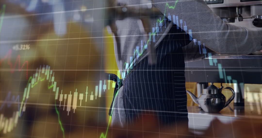 This composition blends the video of a coffee-making process with a superimposed digital graph, suggesting the intersection of entrepreneurship and data analysis. Suitable for illustrating articles about cafe businesses with a technological edge, economic analysis in the food sector, or the role of technology in small business growth.