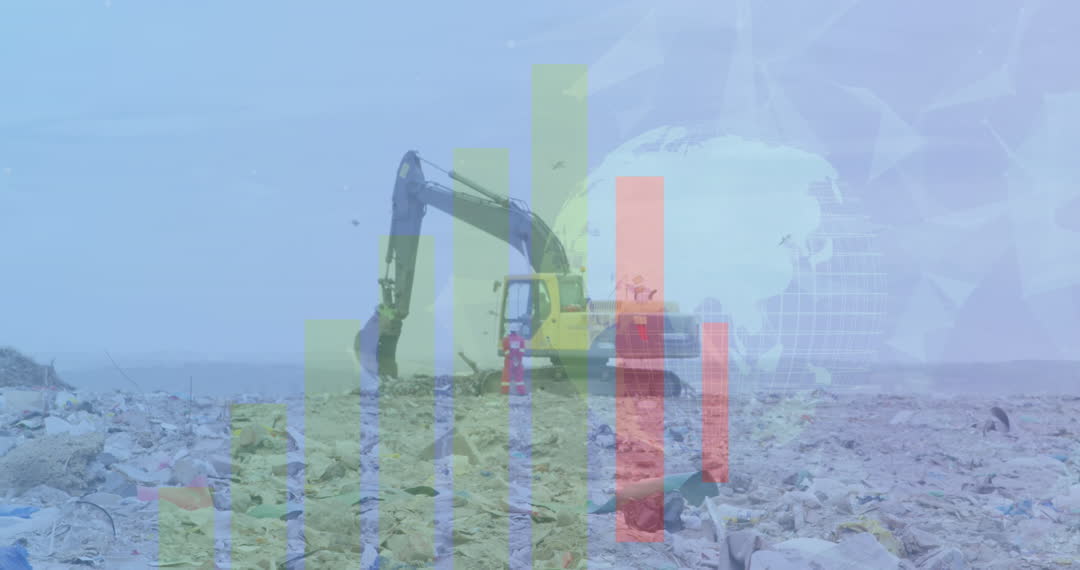 A visualization featuring an excavator at a landfill overlaid with data graphics symbolizes the intersection of environmental practices and technology. Highlighting the relevance of waste management expertise, digital analytics, and global business engagement, this graphic is ideal for illustrating articles, reports, or presentations focused on sustainability efforts, environmental impact assessments, technological advancements in waste management, or data-driven solutions for global ecological challenges.