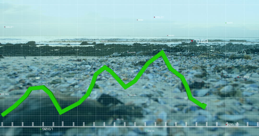 Visual representation combines environmental pollution with financial graph analysis, showing garbage accumulation on a beach overlaid with a fluctuation line graph. Useful for illustrating the connection between environmental issues and economic indicators. Suitable for materials on sustainability studies, eco-awareness campaigns, or pollution impact reports.