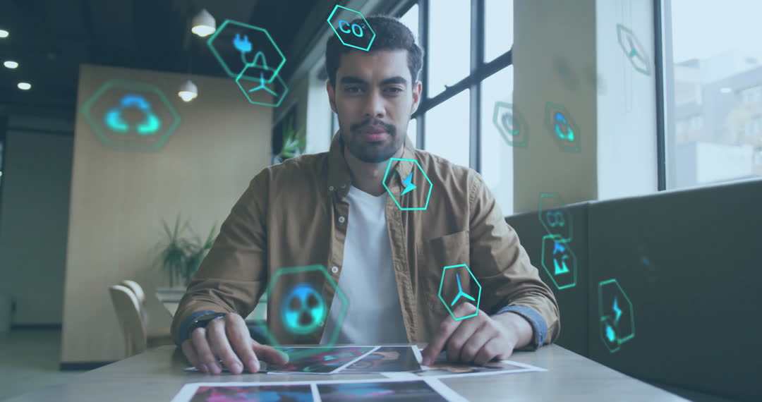 Mixed ethnicity man sitting at desk surrounded by digital holograms of environmental icons, symbolizing technologies related to recycling and sustainability. Perfect for themes related to modern office work, technological innovation, and sustainability in business settings. Use this in presentations or publications about eco-friendly business practices or advanced technology strategies.