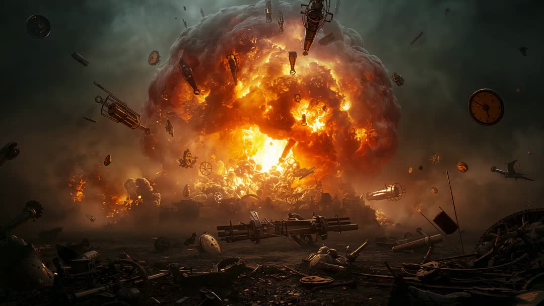 AI Generated Image. The intense visual captures an explosive scenario where a fiery cloud envelops the dark landscape, simulated with AI technology. Shattered remains of various objects such as rifles and mechanical components scatter across the scene, emphasizing themes of mayhem and turmoil. Useful for illustrating concepts of apocalyptic narratives, wartime destruction, or depicting dramatic action in a fictional context like movies, games, or graphic novels.