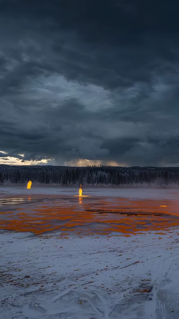 AI Generated Image. Video capturing erupting steam column from geothermal vent with secondary spout pulsing in glowing orange mineral pool under dramatic stormy sky. Foreground showing snow and mineral terraces reflecting warm tones while background showing dense forest silhouette and heavy clouds. Conveying ominous, dramatic, mysterious mood ideal for science and nature storytelling. Working well as documentary opener, supporting science explainer, anchoring travel promo, enhancing environmental story, framing weather forecast segment, powering social media vertical ad. Filming in vertical 9:16 orientation, featuring low light twilight conditions, recommending high dynamic range and slow motion playback to emphasize steam motion and mineral reflections.