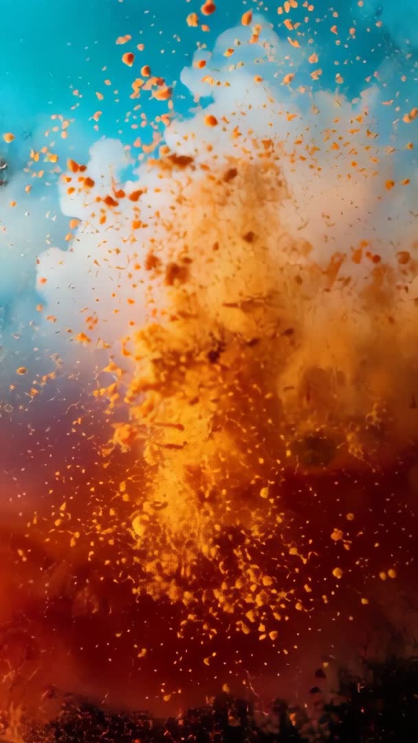 AI Generated Image. Vertical video showing erupting orange pigment cloud bursting and fragmenting upward against vivid blue backdrop, creating dynamic abstract motion filled with airborne particles and pigment clumps. Close-up perspective highlighting texture, contrast, and suspended debris, with cinematic color separation between warm orange plume and cool blue background. Footage working well for background loops, music visuals, festival promotions, product launch teasers, social media reels, and motion design projects. Color palette providing bold contrast for title cards, transitions, and visual effects. Editing tips: using slow motion and overlay blending to emphasize texture, adding directional light leaks for depth, pairing with energetic soundtrack or sound design for impact. Optimized for vertical platforms and mobile viewing.