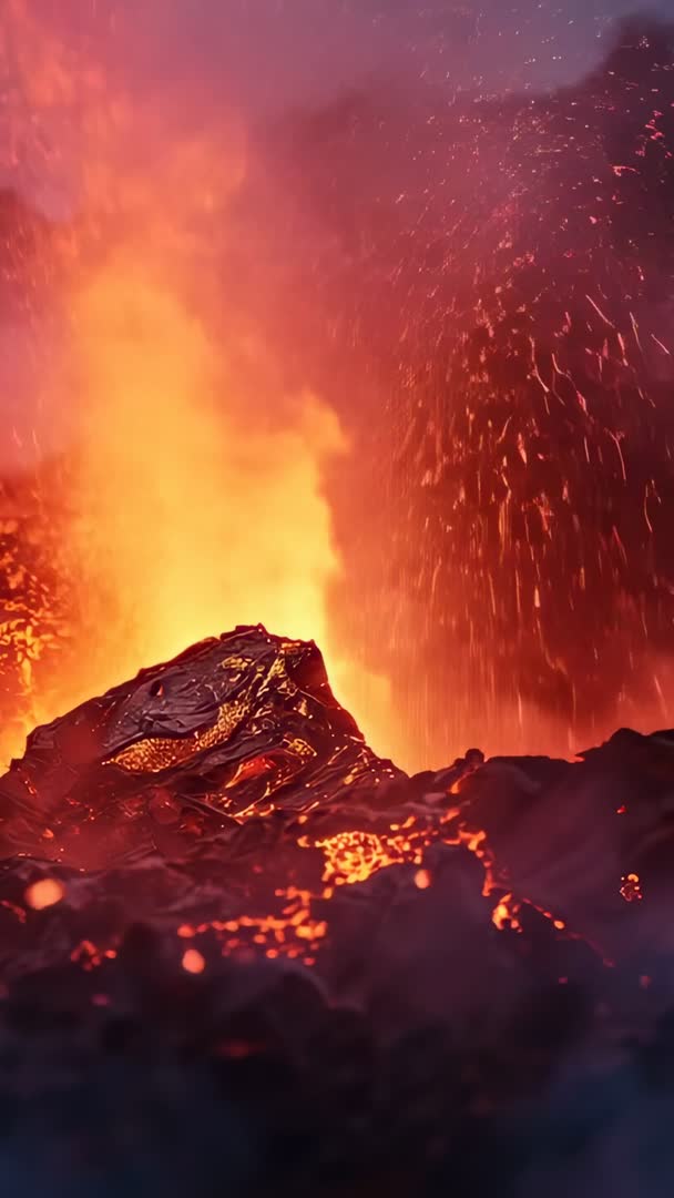 AI Generated Video. Showing intense volcanic vent erupting, sending glowing lava and spitting embers into towering plume of ash and smoke. Presenting close-up vertical footage highlighting molten textures, glowing fissures, falling sparks and dramatic color contrast between molten orange and dark cooled rock. Serving documentary openers, geology lesson clips, natural disaster coverage, hazard awareness campaigns, cinematic trailer backgrounds, social media reels and mobile-first ads. Pairing with deep low-frequency rumble and crackling ember sound design, applying slow-motion or time-lapse edits, and using color grading to enhance warmth and contrast. Working well as headline visual for news packages, educational modules, museum exhibits, environmental storytelling and commercial stock libraries seeking dramatic nature content.