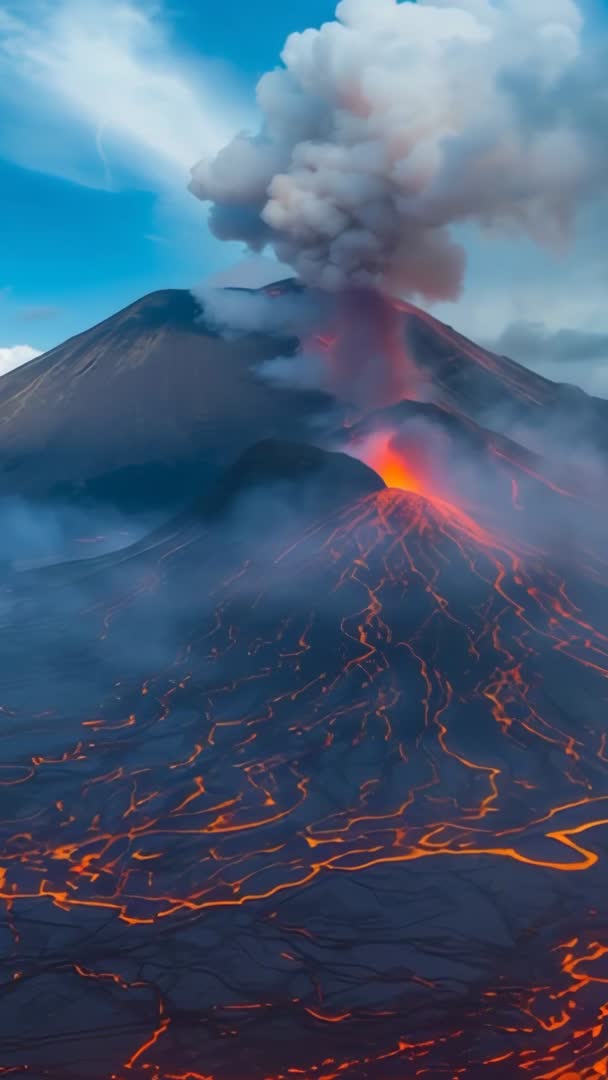 AI Generated Image. Vertical footage showing erupting volcano sending towering ash plume and glowing lava streams carving slopes under blue sky. Scene capturing dramatic contrast between cool sky tones and fiery molten flows, with steam and smoke drifting across landscape. Offering versatile clip for documentary sequences, news packages, geology and earth science presentations, hazard awareness campaigns, environmental studies, cinematic openers, and social media reels. Working well as background for title cards, lower thirds, or time-lapse edits. Providing high-impact visuals for tourism warnings, travel content, emergency response training, and promotional material for adventure and nature channels. Working well for widescreen-to-vertical crops, close-up motion graphics overlays, and sound design using rumble and crackling effects.