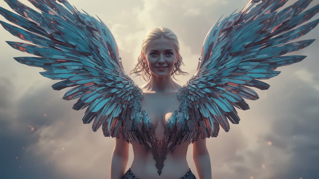- Ethereal Armored Warrior with Shimmering Metal Wings in Clouds