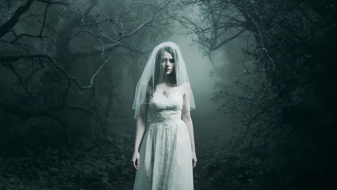 - Ethereal Bride Walking Through Mysterious Misty Forest