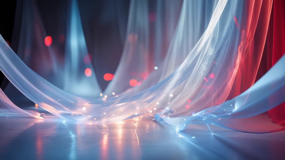 AI Generated Image. Elegant and artistic composition captures flowing sheer fabric displaying ripple effects. Tinily glowing orbs harmonize with chic ambient red and blue light silhouettes, stirring a sense of balance instilled by luminous threads pushing across reflective floor surface, fostering delicate visual contrast. Ideal for decorating creative project's collaterals, crafting atmosphere celebratory event promotions needing spirit of dreamlike charm. Easily applied to serve backdrop tool support needs reflect venue abstracts