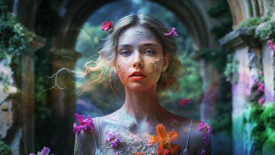 AI Generated Video. A wonderful synthesis of light and mysticism where a fantasy character is shown adorned with floral patterns. Lighting enhances aspects of mystery and charm emphasized by the vivid floral details. This evokes realms ideal for use in fantasy genres, artistic events, book covers oriented towards mythical and romantic themes.