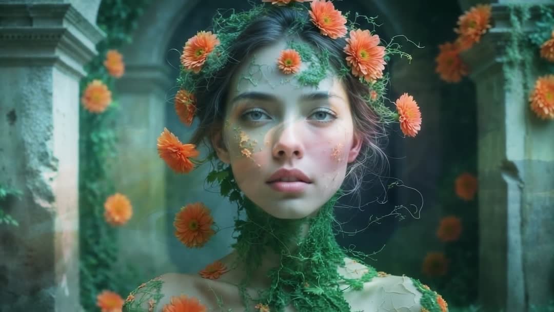 AI Generated Video. Mystical illustration depicting a woman adorned with blooming orange flowers and climbing vines interwoven with her being in an ancient setting. Suitable for use in projects related to fantasy art, nature-themed designs, mystical content, or promotional material for imaginative products. Captures an enchanting harmony between human and nature.