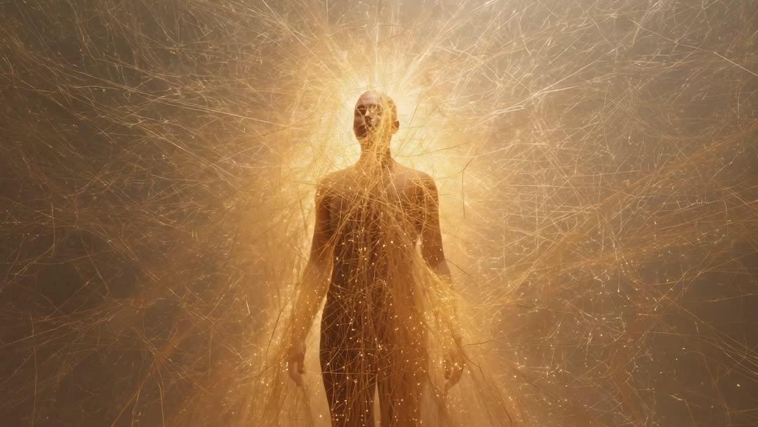 AI Generated Image. Depicting humanoid figure radiating golden filaments and sparks within expansive glowing energy field. Featuring luminous halo, translucent silhouette, intricate particle trails and soft bokeh highlights. Using warm gold palette and high contrast to convey inner light, awakening and transformation. Working well for tech and wellness projects, sci-fi visuals, meditation and spiritual content, album covers, cinematic VFX and digital art showcases. Serving as video background, loopable visual for events, VJ sets, promotional reels, website hero sections and social media motion posts. Providing space for color grading, slow motion playback and overlaying text or logo without cluttering. Ideal for concept presentations, branding for mindfulness apps, futuristic storytelling and immersive projection mapping.