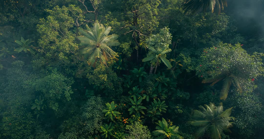 AI Generated Image. The mesmerizing view captures a lush jungle as seen from above, with a vibrant canopy and mystical morning mist weaving through the curtains of fan-shaped palms. The abundance of green showcases its biodiversity, suggesting this could be invaluable for documentaries focused on native ecosystems, environmental education, or conservation-themed reports portraying the wonders of nature.