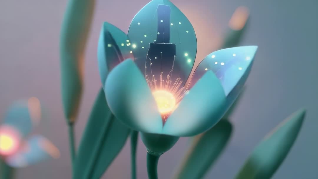 AI Generated Image. This video portrays a surreal and dreamy representation of a stylized flower with luminescent properties, featuring translucent petals and a softly glowing core within a futuristic garden setting. The petals appear to be gently closing, suggesting a change in phase or mood. The design is both minimalist and elegantly detailed, and it provides a captivating visual for any project focusing on fantasy, virtual worlds, or nature-inspired technology. This can be utilized as a background for digital projects, to add an ethereal touch to websites, or as a metaphor for closing transitions in publications.