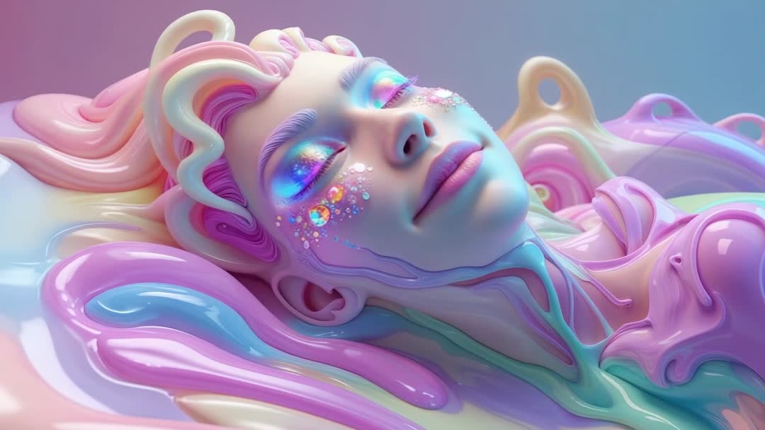 AI Generated Image. Image captures a mystical, pastel-infused face and body peacefully immersed in swirling liquid textures with glimmering gemstone accents. Perfect for digital art projects, fantasy concepts, or dream-inspired designs, providing an enchanting and serene aesthetic.