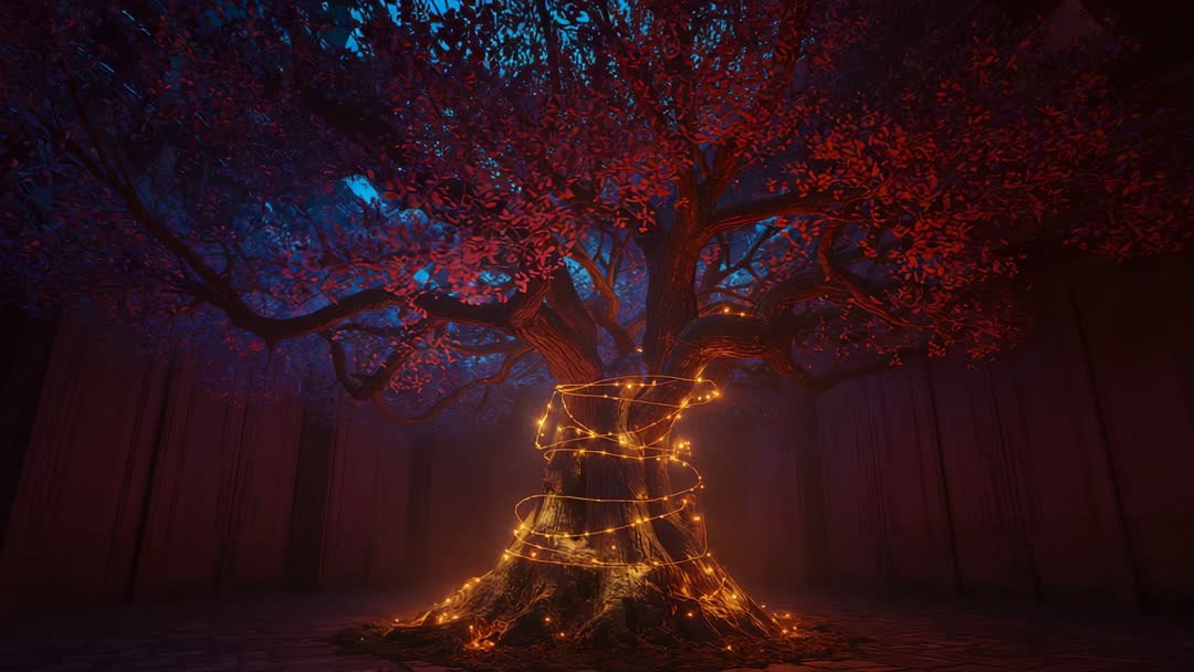 - Ethereal Red-Leafed Tree with Spiraling Golden Lights